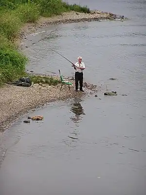 Bank fishing is fishing from banks or shores, typically very near but still above the water's edge. Bank fishing from rocky outcrops that protrude into the water is usually called rock fishing. Bank fishing is typically done by angling, casting a tethered hook dressed with bait or lure into the water, and is usually performed by a rod often equipped with a reel, but handlines, nets, traps, bows, spears and snag hooks can also be used.