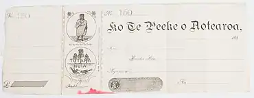 Cheques were issued by customers but the bank issued no banknotes. It provided banking and monetary services to Māori and sample banknotes bore the legend 'E whaimana ana tenei moni ki nga tangata katoa' (this money is valid for all people). There were branch offices at Maungatautari and Maungakawa. There is evidence that it remained in business until at least 1905.[1]
