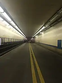 The tunnel was built in sections and floated to the proper positions, then sunk. Each section was sunk next to the previous section and joined underwater. When all sections were connected, and concrete set into place, they were pumped dry and finished out. The depth of clearance is 40 ft (12.2 m) for the ship channel over the tunnel.[2] The entrances were designed in the Art Deco style that was popular during the time of construction.[4] It was completed in 1940 at a cost of $4 million and opened to the public on February 20, 1941.[1][4] A toll fee was charged at the east side, from 1941 to the mid-1970s, when the toll plaza was dismantled. The tube carries two lanes of travel, and no pedestrian or non-motorized vehicular traffic is permitted.[1]