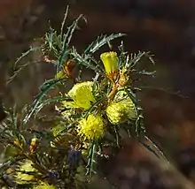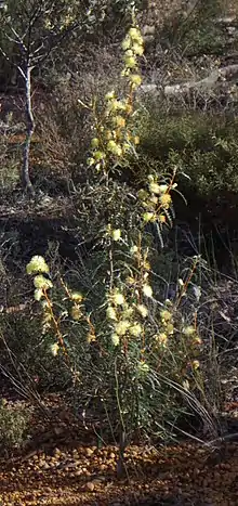Banksia acanthopoda is a species of shrub in the family Proteaceae. It grows as a small spreading shrub to 2 m (6+1⁄2 ft) high and has prickly leaves and yellow composite flower heads, called inflorescences, composed of 50 to 60 individual yellow flowers. Flowering takes place in the southern hemisphere winter. Endemic to Western Australia, it occurs only in a few populations in the vicinities of Woodanilling, Katanning and Darkan. Because of its rarity, it is classed as "Priority Two" conservation flora by Western Australia's Department of Environment and Conservation.