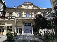 The headquarters building of the Banque de Salonique in downtown Thessaloniki was designed in 1905 by Vitaliano Poselli,[12] and completed in 1909,[13] on ground that was previously the large garden of the Allatini family mansion.[4] It was damaged in the Great Thessaloniki Fire of 1917[14] and again in the 1932 Ierissos earthquake,[15] but was subsequently repaired. After World War II and the Banque de Salonique's demise, it hosted the Bank of Chios from 1950 to 1954,[13] when the Voreopoulou family purchased it and renamed it "Malakopi Arcade" (Greek: Στοά Μαλακοπή) in memory of their ancestral town, now Derinkuyu in central Turkey. Its clock was stopped by the 1978 Thessaloniki earthquake and, in memory of that event, stands still at 11:05.[12] The building was listed as a protected landmark in 1983.[13] As of 2021, one of the arcade's shops is named Pizzeria Poselli in a tribute to the building's architect.[16]