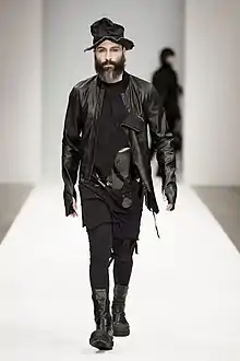 In her fashion designs, she makes extensive use of draping and layering techniques, often creating asymmetrical garments that can be worn in multiple ways. Juxtaposition and deconstruction play a central part, with Gongini predominantly using black and non-colors 'to allow fabrics and textures to speak as color instead'.[3] She combines a variety of natural and recycled textiles, sometimes mixing several types of materials, such as wool, leather, cotton and plastic, in a single garment.[12] Gongini's leather garments are often treated to give a dramatic texture that is reminiscent of the Faroese landscape.[13] Her designs are available at the BARBARA I GONGINI headquarters showroom in Copenhagen and in specialized avant-garde clothing stores worldwide. Gongini's avant-garde design philosophy means that the collections are not trend-based, but focus on 'nurturing a longevity formula'.[3] She often compares her collections to new chapters to turn to in a story, describing them as 'numerical'.[14] As a proponent of the zero-waste wardrobe, she seeks to lengthen the life-cycle of garments through innovative designs called 'multiways'. [4]