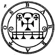 In the Grand Grimoire, Barbatos is named as the 6th of the 18 spirits who serve the seven superior spirits, namely, he is under the command of Satanachia along with Pruslas and Aamon.[2]