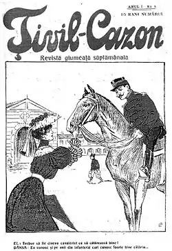 In 1906, Lăzăreanu founded the satirical weekly Țivil-Cazon ("Civilian-Conscript"),[27] for which he used the pseudonym "Bélé".[4] The magazine, discreetly sponsored by the Jewish tailor Moris Segal,[28] hosted the work of Ioachim Botez, Ioan Dragomirescu-Dragion, Leon Wechsler-Vero, and Victor Eftimiu,[29] who was also a pseudonymous co-editor. Eftimiu and Lăzăreanu's work for it included rhyming quatrains that parodied or mocked the more serious literary reviews.[30] Eftimiu noted, years later, that Bélé was "very talented".[31] Țivil-Cazon became the first Romanian journal of its kind to feature colored prints, and included artwork by Iosif Iser, Nicolae Petrescu Găină, and Nicolae Mantu. Heavily inspired by Ion Luca Caragiale and his Moftul Român, it mainly targeted Romanian Army personnel, depicted as slow-witted and (especially if cavalry officers) as sex objects.[32]