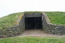 Barclodiad y Gawres (Welsh for 'The Giantess's Apronful'; Welsh pronunciation: [barkˌlɔdjad ə ˈgau̯rɛs]) is a Neolithic burial chamber between Rhosneigr and Aberffraw on the south-western coast of the island of Anglesey in North Wales.[1] It is an example of a cruciform passage grave, a notable feature being its decorated stones. Similar graves and marks exist across the Irish Sea in the Boyne Valley.[2]
