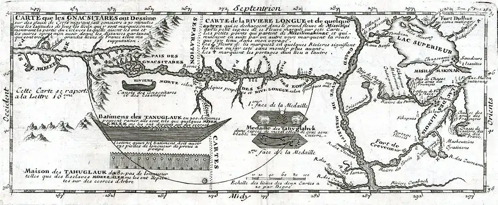 Having already faced the reality of settler life in Beaupré, de Lahontan again led his men to Boucherville to live with local habitants between 1685 and 1687 – himself dividing his time between hunting and classical literature.[1] Just prior to a decision to return to France, Lahontan was ordered –at least in part because of his knowledge of the Algonkian language- to head a detachment of French and native troops towards Fort St. Joseph where he would launch another attack on the Iroquois.[2] He was a restless commander and spent much of his time exploring the region. In 1688 following news of the abandonment of the post at Niagara and renewed attacks of the Iroquois, he burned his fort and led his men to Michillimackinac in search of supplies and possibly entertainment for his men.[2] De Lahontan felt that without supplies from Niagara his dwindling stores would not be enough to last the winter. During the winter and spring months he explored the upper Mississippi valley where he ascended the “Rivière Longue”; some scholars consider this a fanciful tale, others argue that he had discovered the Missouri River.[3]