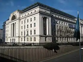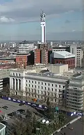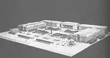 In 1926, the city council organised an open competition for the new layout of the Civic Centre, however, many of the designs were deemed 'Too Ambitious'. As a result, the city engineer was asked to work with the architects of the Hall of Memory, S. N. Cooke, to create a better design. T. Cecil Howitt of Nottingham was asked to design the first building, which was to become Baskerville House. This was approved in 1936 and construction began in 1938.[3] It became the only component to be built from the plan for the Civic Centre which would have covered all of Centenary Square and the Convention Centre, and included the Masonic Hall (192627 Rupert Savage) (demolished 2008) and Birmingham Municipal Bank (recently TSB) building (193133 also T. Cecil Howitt) on Broad Street. World War II halted construction of Baskerville House (hence the rear brick wall, intended to be temporary), and after the war the use of Roman Imperial imagery on public buildings went out of fashion. A 1941 model of the proposed Civic Centre, designed by William Haywood, Secretary of The Birmingham Civic Society, is displayed in the Birmingham Museum & Art Gallery.