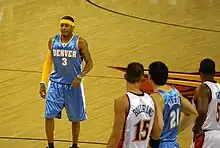 Allen Iverson (#3) wearing a basketball sleeve in a Denver Nuggets game against the Golden State Warriors.