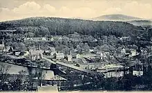 Situated at the head of navigation on the Connecticut River, and shielded from strong winds by the Green Mountains to the west and White Mountains to the east, Bath soon developed into "...one of the busiest and most prosperous villages in northern New Hampshire."[5] Intervales provided excellent alluvial soil for agriculture, and the Ammonoosuc and Wild Ammonoosuc rivers supplied water power for mills. The population reached 1,627 in 1830, when 550 sheep grazed the hillsides.[4] A vein of copper was mined. The White Mountains Railroad up the Ammonoosuc River valley opened August 1, 1853, shipping Bath's lumber, potatoes, livestock and wood pulp. By 1859, the town had two gristmills and two sawmills.[6] Other industries would include a woolen mill, creamery, distillery and two starch factories.[7]