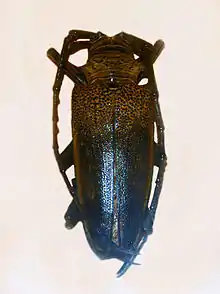 Batocera laena is a huge long-horn beetle reaching about 45–60 millimetres (1.8–2.4 in) of length. The length of the antenna may reach about 120 millimetres (4.7 in).