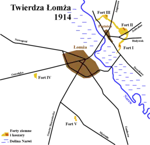 Among the most important positions in the region was a fortified bridgehead of Łomża, the so-called Łomża Fortress. The position, consisting of three large forts in Piątnica (Forts I, II and III), on the northern side of the Narew, and two additional isolated forts (Fort IV and V) on the southern bank, was constructed by Imperial Russian Army between 1896 and 1914. Although outdated and unsuitable for modern warfare, the forts in Piątnica were upgraded with trenches, barbed wire obstacles, chevaux de frise and 12 reinforced concrete bunkers in 1939.[3] Similarly the southern bank around Łomża was reinforced with 9 more bunkers, though shortly before the war their machine guns were moved to Piątnica.[4] The forts were manned by 1st Battalion of the 33rd Infantry Regiment (under Maj. Stanisław Wyderko), part of 18th Infantry Division.[3] The machine gun bunkers were manned by 1st MG Company, 1st Battalion, 42nd Infantry Regiment under Lt. Franciszek Zaręba while the trenches around them were manned by two rifle companies of the 33rd regiment.[3] The frontal positions were supported by 1st platoon of 33rd regiment's anti-tank company (under Lt. Zygmunt Olkowski) and a platoon of outdated 76 mm wz. 1902 guns.[3] The southern side of the river was manned by 3rd Rifle Company, 1st Battalion, 33rd Regiment (under Lt. Aleksander Siejak), supported by 3rd battalion, 18th Light Artillery Regiment (under Capt Stanisław Krug) and a howitzer detachment of 18th Heavy Artillery Regiment (Lt. Col. Władysław Brzozowski).[4]