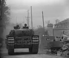 After securing the perimeter, 46, 47 and 48 Commandos were sent to support the Canadians and 6th Airborne division while 41 Commando stayed behind.[56] For the next week, the commandos harassed the strongpoint with occasional mortar fire, RAF rocket firing Hawker Typhoon strikes and volleys from two attached Royal Marine Armoured Support Group (RMASG) Centaur tanks.[2] Although the site did not threaten Allied movements in the area, it provided radar-ranging information for Luftwaffe night fighters and constantly reported on British movements.[3]