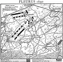 Unnoticed by Waldeck, Luxembourg had enveloped his flanks. Had the Allied commander realised that Luxembourg had split his army in two, he might have overwhelmed the isolated French left before the right came into position, but he did not.[2] After the French right wing was in position (commanded by Luxembourg himself), their artillery opened fire at about 10:00, striking the Allied infantry with great effect. The French left wing, commanded by Lieutenant-General Jean Christophe, comte de Gournay, opened their attack with a cavalry charge but Gournay was killed in the assault; his death disordered his cavalry which withdrew to Fleurus to regroup.[13][14]