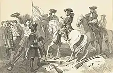 Fleurus was one of the bloodiest battles of the age, with enormous losses on both sides, but casualty estimates vary greatly. According to Austrian historian Gaston Bodart, the French had 3,000 men killed and another 3,000 wounded, and the allies suffered 6,000 killed, 5,000 wounded and 8,000 captured.[18] Périni writes that 612 officers and 3,000 soldiers were killed or wounded on the French side, and that the allies had 5,000 killed and 9,000 captured, but does not mention a number of wounded. Additionnally, the French took 48 guns and 150 flags or standards.[19] Other historians reduce allied casualty numbers to 7,000 killed and wounded and argue that French losses were at least equal,[16][20] while Dutch sources bring the amount of prisoners down to 3,000.[21] The Allies also captured 34 banners and standards, which was rare for a losing side.[22] Dutch historians have generally emphasized the bravery and skill of their infantry and like to quote Luxembourg, who is reported to have said that the Dutch foot soldiers surpassed those of the Spanish at Rocroi and that he wanted to remember them all his life.[22][23] French historian François Guizot described Fleurus as a complete French victory, but one devoid of result.[24] Louvois, Louis’ war minister, wanted to order Luxembourg to immediately besiege Namur or Charleroi, but Louis, concerned about the dauphin's forces on the Rhine, ordered Luxembourg to detach part of his forces and forgo a major siege. Louvois objected, but King Louis wanted to be sure that nothing ‘disagreeable’ happened to his son's command.[25] Nevertheless, Luxembourg was able to put much of the land east of Brussels under contribution.[26]