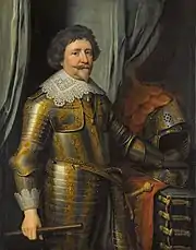 The Prince of Orange departed The Hague on 25 May and, on 1 June, the same day that the French Army laid siege to Saint-Omer, in Artois, he took command of the field army of the Dutch States, which had been assembled at a camp in the village of Lithoijen, in Brabant. A 3,000-men detachment under Count Henry Casimir of Nassau-Dietz was sent to Nijmegen to guard the southern border of the Republic, while Frederick Henry led the bulk of the army to Dordrecht, where it embarked aboard a fleet of 30 warships that convoyed it with its artillery, horses and baggage to Bergen op Zoom.[19] Frederick Henry had planned at first to besiege Hulst, but, pressed by a deputation of the States General, he finally agreed to move upon Antwerp. To fully invest the city and prevent it from being relieved from Hulst and Ghent, the prince dispatched a force of 7,000 infantry and 300 cavalry under Count William of Nassau-Siegen aboard 53 large boats and many smaller ones —taken in 1631 from the Spanish at the Battle of the Slaak— to land at the Waasland, west of Antwerp.[20][21] They embarked at Dordrecht a day before that the main army did it, though both forces reunited briefly at Bergen op Zoom before the landing operation was undertaken.[22]