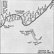 Major Frank North saw an Indian rise from cover and take aim at him. He shot and killed the man, who turned out to be Chief Tall Bull.[6] Meanwhile, the Pawnee surrounded 20 Cheyenne warriors who were sheltering in a ravine. Armed only with bows and arrows, the Cheyenne kept their attackers at bay until their arrows ran out, whereupon the Pawnees moved in and killed them all.[5]