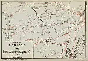 The Battle of the Crna bend[lower-alpha 1] was a two-month-long battle between the Bulgarian and the Entente armies. The battle took place in the Macedonian front during the First World War Allied Monastir Offensive in October and November 1916. After extremely heavy fighting and severe casualties on both sides, the Bulgarians retreated from Bitola on 19 November, taking positions at 5 km to the north by defeating all later attacks from there. However, the Entente entry in Bitola had no strategic value.[4]
