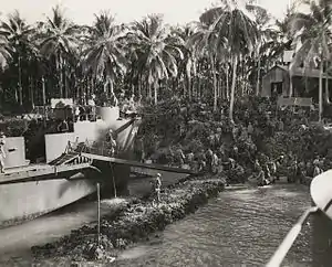 As the beachhead was established, there was only a brief resistance from several Japanese barges around Sirot Island, before a perimeter was established. Elaborate measures were implemented to defend against a potential counterattack from Rabaul. Patrols were sent out, and carrying parties began moving stores off the beaches further inland. A brigade headquarters was established around Tangalan Plantation, while Barrowclough's divisional headquarters was set up around Pokonian.[21] The perimeter was held throughout the night.[20] On 16 February, the New Zealand infantrymen began to push inland across the island. The 30th Infantry Battalion cleared the eastern side of the island around the Pokonian Plantation, while the 37th cleared the northern area of the island from Tangalan Plantation, the 35th pushed south.[22] Each infantry battalion was supported by a troop of Valentine tanks, which provided close support and helped clear tracks through the jungle.[23]