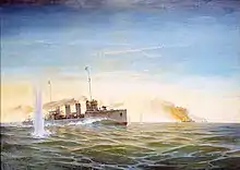 Four large, flat-bottomed barges loaded with German troops attempted to land at Pernau on 20 August, but were repelled by small Russian warships. The Russian gunboat Sivuch was destroyed in an engagement with the German light cruiser Augsburg and eight destroyers.[6]