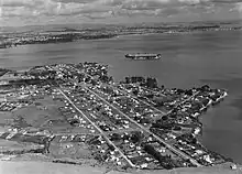 The Beachlands area was grassy farmland until 1922, when it was subdivided by Richard W. Kipplewhite.[8] Beachlands was advertised as a "new marine garden suburb" of Auckland.[10] Beachlands developed into a location for day-trips, with many people visiting from Auckland by ferry. A holiday community grew around Beachlands.[8] In 1929, the first bus service began, linking Maraetai, Beachlands and Whitford to Auckland.[8] In 1948, the Beachlands RSA Hall was constructed.[11]