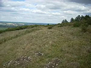 The hillfort is situated on the top of the hill and is defined by a single rampart and a flat-bottomed ditch,[3] which survives as a low bank up to 6 metres (20 ft) wide.[4] The rampart was originally faced with timber,[3] with timber palisades acting as retaining walls on both the inside and the outside.[5] The rampart infill was built with a mixture of soil and chalk,[2] and is best preserved on the south side. On the east and west sides, erosion has reduced the rampart to a scarp, with the ditch silted in to form a terrace.[1] The enclosure is roughly rectangular, with an entrance on the west side.[4] Excavations of the west entrance revealed that a large timber gate was built within the entrance causeway,[1] and uncovered two penannular gold rings (incomplete or unclosed rings). It is possible that there was a second entrance on the northeast side, where a modern track crosses the rampart.[3] Investigation of the interior revealed a general lack of features except for traces a number of small four- and six-posted structures.[6] These are interpreted as having been raised granaries.[2]