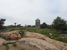 The Perkins Memorial Drive is a scenic road to the summit of Bear Mountain. At the summit, the 40 feet (12 m) Perkins Memorial Tower provides a view of four states and the skyline of Manhattan, 40 miles (64 km) to the south. The road and tower were built by the Civilian Conservation Corps between 1932 and 1934. It is named after George Wallbridge Perkins, the first president of the Palisades Interstate Park Commission.[8]