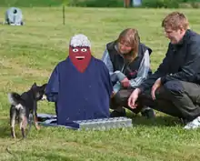 A person wearing a large coat, wide-brimmed hat and sunglasses approaches the dog in a serious, potentially threatening manner, stopping and clapping their hands in 5 second intervals. When they are around 6-7 metres from the dog, they turn around and assume a less-threatening posture. The dog is then released to investigate the person, and when 'contact' has been observed, the handler should praise the dog.[14][17] The dog's response to meeting people who act in an unusual and possibly deviant way, is assessed.[16]
