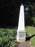 The Wister family later built a gazebo on this site that as of 2014 is in a ruined state. Northwest of the summer house was an obelisk at the end of a garden walk. Peale painted four mottos that governed his life on the base of this obelisk, one on each side. It was Peale's wish to have been buried at the foot of this obelisk, yet it was not to be, as Peale sold Belfield a year before his death.[16] Though Peale was not buried at this location, the Wister family later buried their dog, a white German Spitz named 'Kaiser', there.[17] A reproduction of this obelisk was created by La Salle alumni in 2000.[18]
