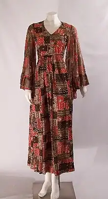 Bell sleeves were originally found on a garment called a chasuble, which was the dress of clergymen during Medieval times. The religious association of these sleeves eventually dissipated at which point the bell sleeve became adapted by the upper class. In the 1500s, the rich began to stylize the bell sleeve by making them more dramatic in size and more elaborate in decor. The trend of this sleeve made its way from the elite of France to England, where this style really took off and made its impact.[1] The movement of the fashion trend of this sleeve moving from the lower class to the upper class is now referenced as the upward-flow theory.