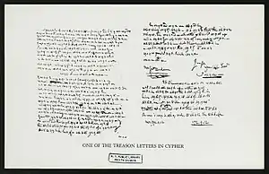 André conferred with Clinton, who gave him broad authority to pursue Arnold's offer. André then drafted instructions to Stansbury and Arnold.[75] This initial letter opened a discussion on the types of assistance and intelligence that Arnold might provide, and included instructions for how to communicate in the future. Letters were to be passed through the women's circle that Peggy Arnold was a part of, but only Peggy would be aware that some letters contained instructions that were to be passed on to André, written in both code and invisible ink, using Stansbury as the courier.[76]