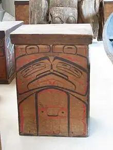 Bentwood boxes are a traditional item made by the First Nations people of the North American west coast including the Haida, Gitxsan, Tlingit, Tsimshian, Sugpiaq, Unangax, Yup'ik, Inupiaq and Coast Salish. These boxes are generally made out of one piece of wood that is steamed and bent to form a box. Traditional uses of the boxes was varied and included storage of food goods, clothing and for burial. They were often without decoration while others were decorated elaborately. Today many are made for collectors and can be purchased from museums, gift shops and online sites as well as directly commissioned from the artists.[1][2][3][4]