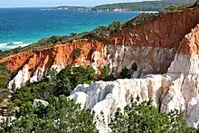 The park is fairly flat, with none of the northern section exceeding 100 metres (300') in elevation, and the southern section not much higher; the tallest peak is Haycock Hill at 252 metres (827').[14] The region is particularly windy, dry and cold, and the headlands are covered in a low ground-hugging heathland community of plants. Further inland, the heath is replaced by open eucalypt woodland, which makes up most of the park's habitat.[3] The two dominant tree species are silvertop ash (Eucalyptus sieberi) and red bloodwood (Corymbia gummifera).[15] There are also scattered pockets of rainforest in gullies and protected areas, with species such as the scentless rosewood (Synoum glandulosum) and smooth mock-olive (Notelaea venosa).[16]
