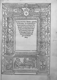 Berengario made several important advances in anatomy including the first anatomical text augmented by illustrations, "Anatomia Carpi. Isagoge breves perlucide ac uberime, in Anatomiam humani corporis".[2] This book emphasized the sensory over textual versions of the truth, an emphasis on dissection of human cadavers, some first denials of Galenic anatomy based on personal experience in dissection, and a preference for dissection of numerous bodies following a specific program of investigation. Whereas other anatomists claimed few actual dissections to their name, in 1522 Berengario da Carpi claimed to have anatomized several hundred bodies.[3] He also denied the existence of Galen's rete mirabile. Later Vesalius claimed he was the first to do so.