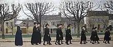 After several plane accidents, Boutet de Monvel left Macedonia in June 1917 with the Légion d'Honneur award and five commendations.[25] He was transferred to Fez, where the 551st squadron was based, in October 1917.[26] At the request of General Lyautey, who was the Resident-General of French Morocco, he began to paint again for the first time since war had been declared. Continuing in his rectilinear style, he painted the city of Fez and its inhabitants at all hours of the day. He also painted in Rabat and Marrakesh.[26] In the year and a half before he was demobilized in March 1919, he created a singular and powerful vision of Morocco, whose austerity kept it far from orientalist cliché.[26] His Moroccan paintings and his bas-reliefs, which Boutet de Monvel always considered his finest work, were exhibited in 1925 at the Henri Barbazanges gallery under the patronage of Marshal Lyautey.[27] The introductory text to the catalogue, written by Jérôme and Jean Tharaud, ended with these words: “(In Morocco) Boutet de Monvel set down on paper the appearance of a day and forever, just at the point where this profound element is at risk of disappearing”.[28]