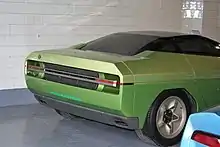 The Ramarro uses the chassis from a 1984 C4 Corvette, the same car used to unveil the C4 to the European press at the 1983 Geneva Motor Show. Chevrolet gave Bertone that car to use to build the Ramarro, as well as a port fuel injection V8 engine from the newer 1985 Corvette.[2] The engine remains mostly stock but the radiator and air conditioning have been moved to the back of the car, taking the place of the spare tire which was moved in front of the engine, in order to allow Bertone to design the body with a more tapered, sealed off nose for better airflow and aerodynamics.[1] In order to get air into the radiator, air intakes were placed just behind the rear window on both sides. The only other mechanical change was the addition of experimental Michelin tyres in place of the original Goodyear units. These new tyres measure 280/45VR-17 in the rear and 240/45VR-17 in the front.[2] On the outside, the Ramarro also features sliding doors that slide forward towards the nose of the car, making them easier to open in tight parking spots versus conventional doors which had a wide opening span.[3] Many reviewers have drawn a comparison between these and the doors on the 1954 Kaiser Darrin but the Ramarro's doors are different in that they slide out and forwards whereas the doors on the Darrin retracted into the front fenders.[4]