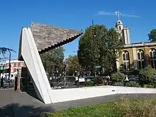 The "Stairway to Heaven Memorial Trust" was established in 2007 to create a more prominent public memorial to those who died in the disaster. The memorial was designed by local architects Harry Patticas and Jens Borstlemann of Arboreal Architecture.[23][24] It was sited in a corner of Bethnal Green Garden, immediately outside the tube station, and was unveiled on 16 December 2017, more than 74 years after the event. It takes the form of an open inverted stairway of 18 steps made of teak overhanging a concrete plinth, and is a full-sized replica of the stairway where the disaster occurred. The names of the dead are carved on the exterior and the top covering has 173 small holes allowing light through representing the dead.[25][26][27]