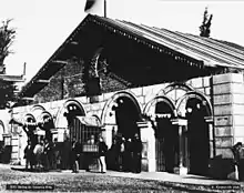 Beyoğlu station, along with its counterpart Karaköy station, is one of the oldest subterranean urban railway stations in the world. Construction began in the summer of 1871 and was completed in 1874, along with the rest of the railway line. Beyoğlu station officially opened, along with Tünel, on 17 January 1875 as Pera station.[1] A 5-story hotel building designed by the chief engineer of Tünel, Eugène-Henri Gavand, was originally planned to be constructed on top of Beyoğlu station. This was never realized and the station building remained a 2-story structure until 1914, when the Metrohan Building was constructed above it.[2]