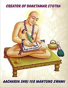 The Bhaktamara Stotra is a famous Jain Sanskrit prayer. It was composed by Acharya Manatunga (7th century CE).[1] The name Bhaktamara comes from a combination of two Sanskrit terms, "bhakta" (devotee) and "amara" (Immortal).
