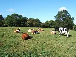 The road was duly built, through what was now a 70-acre property, bypassing the village of Aldenham.[38] In September 1998, visitors to the Janmashtami festival numbered 60,000 – a figure described by the local Borehamwood & Elstree Times in 2007 as "the average number of people" attending the festival each year.[36] According to a 2013 BBC News report, the grounds of Bhaktivedanta Manor now include "a theological college, organic farm, herb gardens, a cow sanctuary, primary school and kitchens providing meals for the homeless".[39]