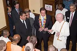 The devotees endured financial hardship during their early years at the Manor, due to the substantial costs involved in maintaining the large property.[13] A habitual international traveller, Prabhupada visited Bhaktivedanta Manor in the summer of 1973[17] and was delighted with the new UK base.[18] During their meeting there in August, he told Harrison: "You have given us this shelter, and Krishna will give you shelter – at his lotus feet."[17] Prabhupada later referred to Harrison as ISKCON's "archangel" for this and other gifts to the movement;[19] in November 1977, while on his deathbed in the Vrindavan temple, the acharya removed a ring from his hand and instructed devotees to deliver it to Harrison.[20][21] Prabhupada's final trip outside India, over August and September 1977, was a visit to the UK centres at Bury Place and Aldenham.[22] While staying at the Manor, he became too sick to undertake a planned tour of the United States,[23] and instead returned to Bombay before being transported to Vrindavan.[24]