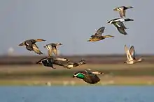 At Bhigwan, ducks, herons, egrets, raptors and waders along with flocks of hundreds of flamingos are present. At times, 1,000–1,200 flamingos[4] are seen.[5] Low rainfall and low water levels have reduced the birds' numbers. More than 230 species of migratory birds are found here, including painted storks, bar-headed geese and demoiselle cranes. These birds are present in the winter season between December and March. The birds generally migrate via marine routes and adult females depart from the breeding grounds.[6][7]