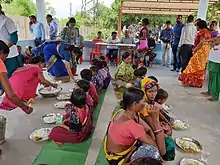 Beneficiary women and children being served midday meal under Mukhyamantri Suposhan Abiyan.