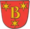 The German blazon reads: In geteiltem Schild oben ein goldener Buchstabe B in Rot, unten drei rote sechszackige Sterne in Gold.