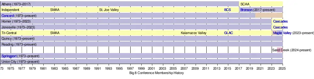Like its predecessor, the Big "8" sustained an extended period of stability. In its first 44 years of existence, there were no members that left or were added to the conference. However, in 2016, Athens, who was the smallest member of the conference and suffering from declining enrollment, left the Big "8" after the 2016–17 school year to join the SCAA. Bronson, who was the only Little "C" member not to be a charter member of the Big "8", would replace Athens for the 2017–18 school year after spending a couple of years in the Berrien-Cass-St. Joseph League.[1] Coincidentally, both these schools were the ones that voted against expansion of the Little "C".