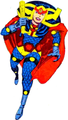 Barda has served as a member of the JLA in her own right as well. At Takion's order, she and fellow New God Orion were sent as agents of New Genesis to serve on the team. Takion predicted that the Earth faced a grave threat.[18] Their mission is to help mobilize Earth's heroes against the omnipotent Mageddon. Over time, they become involved with several other JLA missions. Adam Strange, needing help with an alien invasion, enslaves the JLA as part of a bluff. The League works for days, turning the planet into a giant teleportation beam. The aliens are sent off to the prison planet of Takron-Galtos, which Barda had mentioned several times during the ordeal. In another instance, Barda is badly wounded fighting the Queen Bee, a member of the newly reformed Injustice League. Once Mageddon is defeated, Barda and Orion resign from the JLA.[1][19]