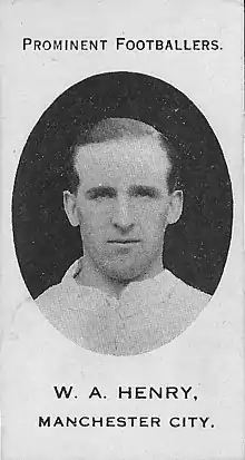 Henry was born in Glasgow[2] and began his football career in Scotland with Rangers and then Falkirk before transferring to Leicester City in England in September 1909.[2][3][4][5] He played 96 times for Leicester before Manchester City purchased him for £1,000 in 1911, the highest fee that Leicester City had received for one of their players at the time.[2] He made his Manchester City debut in a 1–1 draw against Sunderland in November 1911.[2] He went on to make 157 appearances for Manchester City in which he scored one goal.[2] The war hindered his outings for City but he did spend eight years there, the majority of his career.[2] He never got a first-team cap for Scotland, but did get international honours in a military game between England and Scotland at Everton's Goodison Park ground.[6][7]