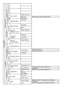 Tail-female pedigree: Young Miss by Young Jim - Miss Mambrino by Red Wilkes - Miss Clark by Alric - Kate by Clark Chief - Lida by Vandalxx.