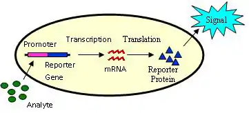 Anatomy of a bioreporter organism. Upon exposure to a specific analyte, the promoter/reporter gene complex is transcribed into messenger RNA (mRNA) and then translated into a reporter protein that is ultimately responsible for generating a signal.