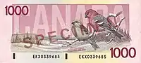 The pink-hued $1000 banknote has an obverse with the same portrait of Elizabeth II used on the $2 banknote adjacent to a vignette of the Centre Block and Library of Parliament, the modern flag of Canada flying from the Peace Tower.[15][27] The reverse features a pair of pine grosbeaks, the engraving of which was based on a watercolour by John Crosby.[27] Originally, it was intended to use an image of a spruce grouse, but its nickname "fool hen" was "considered too controversial".[27] This was the first new $1000 bill printed since the 1954 Canadian Landscape series.