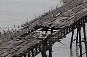 In 1984, £1 million of damage was caused to the pier by drifting equipment during engineering work in Sand Bay, to the north of the pier.[38] The damage was quickly repaired, despite fears that Birnbeck might become like nearby Clevedon Pier, which at the time was severed by a collapsed span.[38] The pier was again badly damaged by storms in 1990 and was closed for safety reasons in 1994. Daily trips during the summer months to and from Cardiff, Clevedon, and Penarth were suspended indefinitely.[30] Due to the decline, English Heritage has placed it on the Heritage at Risk Register.[39] In 1999, the lifeboat station installed a walkway across the pier to allow them safe access to the island, at a cost of £20,000.